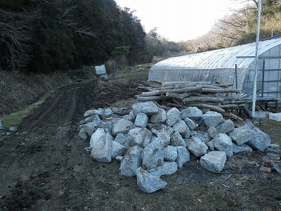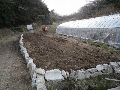 畑のかさ上げ終了です。コンクリートのガラで石垣状の土留めを作り、盛ってあった土を慣らしました。
