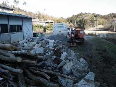 ユンボで吊るとかえって仕事が遅くなるので、ネコで運んで積み上げです。
